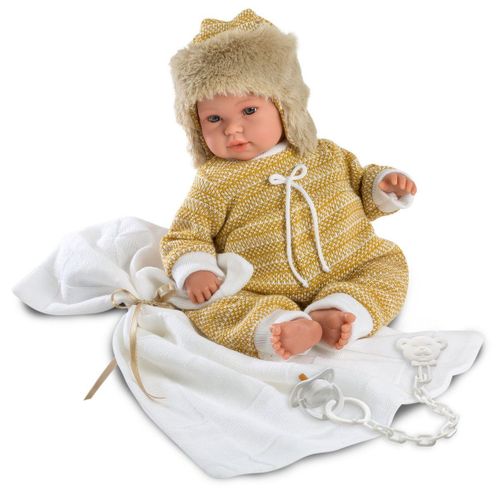 Bebito ma niebieskie oczy i ubrany jest w żółto-białe śpioszki z białą kokardką i lamówkami. Główkę ozdabia urocza czapeczka obszyta beżowym futerkiem. W komplecie znajduje się także milutki, biały kocyk.