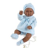 Śliczna lalka, kształtem i mimiką do złudzenia przypomina niemowlę.Każda mała dziewczynka będzie zachwycona lalkami firmy Llorens z uwagi na dbałość o szczegóły oraz wysoką jakoś wykonania. Lalka posiada budowę anatomiczną chłopca. W całości jest wykonana z przyjemnego w dotyku winylu, natomiast ubranka zostały uszyte z wysokiej jakości materiałów. Kończyny oraz głowa poruszają się wokół własnej osi, a oczy są na stałe otwarte. Główkę naszej lali zdobi niebieska czapeczka z pomponami. Ubrana jest w niebieskie spodenki oraz bluzeczkę z długim rękawem ozdobioną atlasową kokardką i skarpetki. Do lalki dołączony jest smoczek, który pełni funkcję dekoracyjną.Lalka zapakowana jest w kartonowe pudełko, idealne na prezent.Długość całkowita to 45 cm. W tej wersji dostępna jest także dziewczynka.Wiekod 3 lat