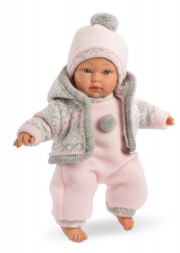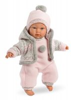 Główkę naszej lalki zdobi różowa czapeczka z pomponem. Bobas ubrany jest w różową piżamkę z szarym pomponem i szarymi elementami, różowo-szarą narzutkę w gwiazdki z kaputrem.
