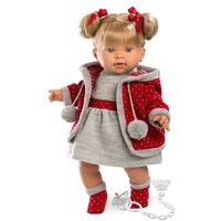 Nasza lalka wykonana jest z wysokiej jakości materiałów. Jej ciało zrobione jest z przyjemnego w dotyku winylu, a brzuszek wypełniony miękką wyściółką. Po wyjęciu smoczka lalka zapłacze i zawoła: mama, papa!Główkę naszej lali zdobią piękne błękitne oczy, jasne blond włoski upięte w dwa kucyki, związane czerwonymi atłasowymi wstążkami. Pippa ubrana jest w szarą sukienkę, ciepłą czerwoną bluzę w szare kropki z kapturem i dwoma wiszącymi pomponami oraz skarpetki pasujące do kompletu. Lalka zapakowana jest w kartonowe pudełko, idealne na prezent. Do lalki dołączony jest ozdobny smoczek.Wiekod 3 lat