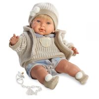 Lalka płacząca AlvaroŚliczna lalka, kształtem i mimiką do złudzenia przypomina niemowlę. Każda mała dziewczynka będzie zachwycona lalkami firmy Llorens z uwagi na dbałość o szczegóły oraz wysoką jakoś wykonania. Lalka została wykonana z przyjemnego w dotyku winylu, brzuszek wypełniony jest miękką wyściółką, a ubranka uszyte są z wysokiej jakości materiałów. Kończyny oraz głowa poruszają się wokół własnej osi, a oczy są na stałe otwarte. Po wyjęciu smoczka z buzi bobas zapłacze i zawoła: mama, papa! Główkę naszej lalki ozdabia beżowa czapeczka z dwoma pomponikami. Alwaro ubrany jest w niebiesko-beżowe body w kratkę, uroczy sweterek z misiem, bluzę z kapturem a jego nóżki ozdabiają skarpeteczki z pomponikiem. Do lalki dołączony jest smoczek, który nie pełni tylko funkcji dekoracyjnej, ale również uruchamia moduł płaczu. Lalka zapakowana jest w kartonowe pudełko, idealne na prezent. Długość całkowita to 42 cm.Wiekod 3 lat
