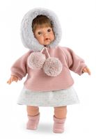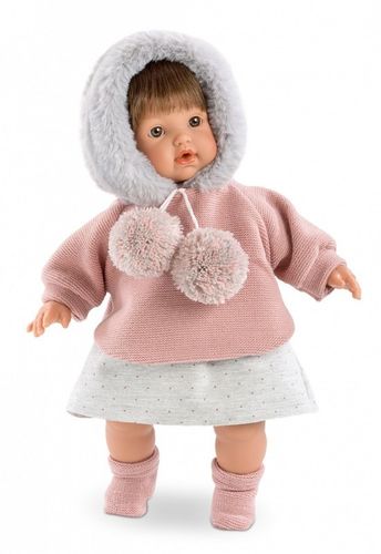Główkę naszej lalki ozdabia ciepły kapturek od sweterka obszyty dookoła szarym futerkiem. Aysel ubrana jest w uroczy strój z długim rękawem w szaro-brązowym kolorze z dwoma pomponikami, pasujące do kompletu spodenki a jej nóżki ozdabiają skarpeteczki. Do lalki dołączony jest smoczek, który nie pełni tylko funkcji dekoracyjnej, ale również uruchamia moduł płaczu.