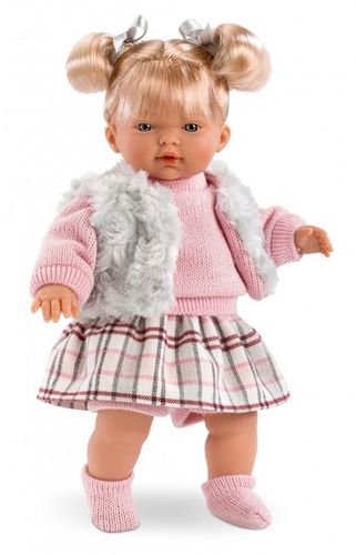 Nasza lalka wykonana jest z wysokiej jakości materiałów. Jej ciało zrobione jest z przyjemnego w dotyku winylu a brzuszek wypełniony miękką wyściółką. Po wyjęciu smoczka bobas zapłacze i zawoła: mama, papa! Główkę naszej lalki zdobią dwie kiteczki obwiązane kokardką. Isabela ubrana jest w różowy sweterek i białą spódniczkę w czerwono-różową kratę, futrzany bezrękawnik oraz skarpetki pasujące do kompletu. Lalka zapakowana jest w kartonowe pudełko, idealne na prezent.Wiekod 3 lat