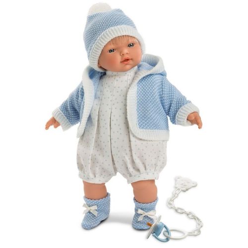 Lalka Roberto płacząca, 33 cm Przedstawiamy Państwu przepiękne hiszpańskie lalki z najnowszej kolekcji Llorens. Autentyczne i doskonale odtworzone kształty lalek oraz szczegóły twarzy takie jak oczy, usta, włosy, na pewno zachwycą każdą małą i dużą dziewczynkę! Doskonały dobór wysokiej jakości ubrań, ich kolor, krój, faktura i liczne detale sprawiają, że lalki te wygladają jak żywe. Dlatego do najlepsze zabawki dla dziewczynek w każdym wieku. Roberto 33295 ma 33 cm i wykonany jest z delikatnego, przyjemnego w dotyku winylu. Jego miękki brzuszek wypełniony jest wyściółką. Po wyjęciu smoczka lalka zapłacze i powie "mama, papa". Roberto ma niebieskie oczy otwarte na stałe oraz krótkie, proste włosy z grzywką w kolorze blond. Ubrany jest w doskonałej jakości luźne body do kolan, z marszeniami u dołu nogawki, w kolorze białym z niebieskimi plamkami. Ma również kaftanik z białą lamówką i kapturkiem, urocze, dzianinowe, niebieskie skarpetki z kokardką oraz niebieską czapeczkę z białą lamówką i pomponem. Lalka występuje także w wersji dziewczynki. Zapakowana jest w eleganckie, kartonowe pudełko, idealne na prezent. Manufaktura Llorens od lat dokłada wszelkich starań aby ich wyroby były doskonałe, autentyczne i piękne w każdym detalu.Wiekod 3 lat