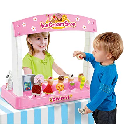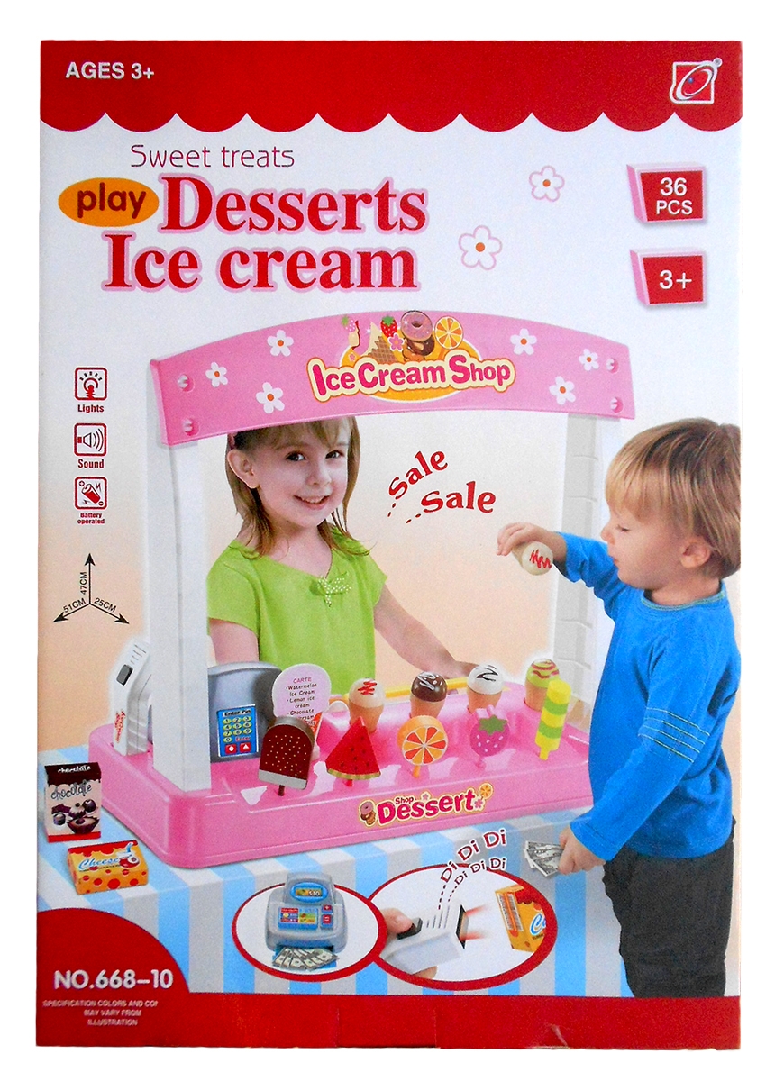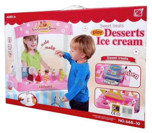 Dziecięca zabawka w postaci lodziarni. Zaprojektowana specjalnie dla maluchów, bez wątpienia zapewni świetną zabawę. Składa się aż z 36 elementów w tym z lodów w rożku, lodów na patyku, pudełeczek ze słodkościami, kasy fiskalnej, czytnika, etykietek, naklejek, zabawkowych banknotów oraz budki, wszystko do samodzielnego montażu. Prosta konstrukcja na pewno nie sprawi nikomu trudności w złożeniu i z pewnością ucieszy wszystkie dzieci. Całość estetycznie zapakowane w pudełeczko z uchwytem, będzie doskonałym prezentem.