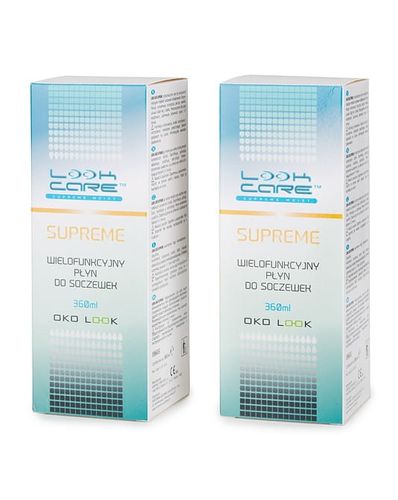 Look Care Supreme przeznaczony jest do wszystkich rodzajów miękkich soczewek kontaktowych. Dezynfekuje, konserwuje, oczyszcza, płucze, nawilża, usuwa ślady łez i białka. Przeznaczony dla oczu wrażliwych, zachowuje aktywność przez 5-7 minut.