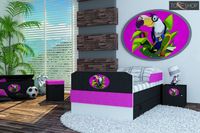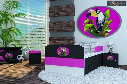 Główne cechy łóżka:• oryginalne wzornictwo• żywe kolory�� podłoga pod materac• szuflada na pościel• stabilna rama z wysokogatunkowej płyty meblowej pierwszego gatunku• miłe w dotyku tapicerowane boki• materac ze zdejmowanym pokrowcem wysokości ok.10cm• fronty łóżka tapicerowane tkaniną ,,easy cleaning” z modnymi motywami Główne cechy materaca:Materac VERSITO LUX jest materacem wykonanym w całości z wysoko elastycznej pianki poliuretanowej. Model ten został zrobiony przy użyciu środków, które nie wywołują alergii, dzięki czemu jest bezpieczny dla astmatyków i alergików. Materac został wyposażony w pokrowiec na zamek, który w razie potrzeby można w prosty sposób zdjąć i wyprać w temperaturze 40 stopni. Materace VERSITO LUX mogą być stosowane w łóżkach ze stelażem regulowanym. Dodatkowym atutem wszystkich naszych materacy jest bezklejowa konstrukcja, wolna od kleju, rozpuszczalników chemicznych itp. Wysokość opisywanego materaca około 10 cm(z tolerancją +/- 1 cm).Opcja kolorystyczna:· czarny/czerwony/biały - obrazek z kotem· czarny/fioletowy/biały - obrazek z tukanem· fioletowy/biały - obrazek z panterą· niebieski/biały - obrazek z niedźwiedziem polarnym· zielony/niebieski/biały - obrazek ze słoniem· niebieski/czarny/biały - obrazek z gorylem· szary/zielony/biały - obrazek z lwem· biały/czarny - obrazek z sowąPo dokonanym zakupie prosimy o informację dotyczącą koloru łóżka.Czas wysyłki: do 14 dni