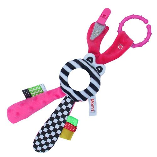 Dziecko zainteresuje się również licznymi tasiemkami-metkami przyszytymi po bokach, które będą stanowiły dodatkową atrakcję dla małych rączek. Dziecko dotykając ich uczy się odróżniać różne struktury, a próbując złapać ćwiczy zdolności motoryczne rączki i paluszków.