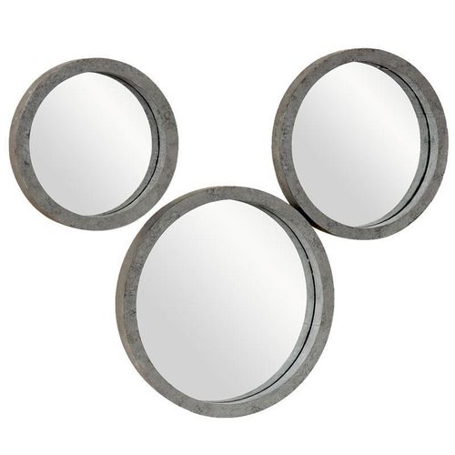 Komplet trzech okrągłych luster ściennych w oprawie z płyty MDF, która do złudzenia przypomina cement. Lustra mają różną średnicę. Rama w kolorze szarym z licznymi pęknięciami i otarciami. Stylowy i elegancki dodatek do wnętrza, który pozwala stworzyć niepowtarzalny i klimatyczny wystrój.