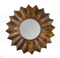 Miedziane lustro Cylenne o średnicy 68cm i grubości 2 cm. Lustro o oryginalnym kształcie ramy imitującym słońce w miedzianym, niezwykle żywym kolorze. Rama wykonana z naturalnego brązu jest wysoce delikatna i bardzo oryginalna. Lustro jako metalowa ozdoba nie powinno mieć kontaktu z wodą. Aby utrzymać jego czystość, wystarczy przetrzeć bawełnianą ściereczką. Lustro w kolorze naturalnej rdzy jest niezwykle eleganckie i jednocześnie dodaje nuty tropików do wnętrza.