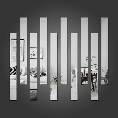 Wykonane z bezpiecznego szkła akrylowego o grubości 3mm lustro w rozmiarze 120 x 195cm (13 pasków w rozmiarze 120 x 15 cm każdy. Rzeczywista wielkość dekoracji zależy od odstępów jakie zrobisz przyklejając paski).