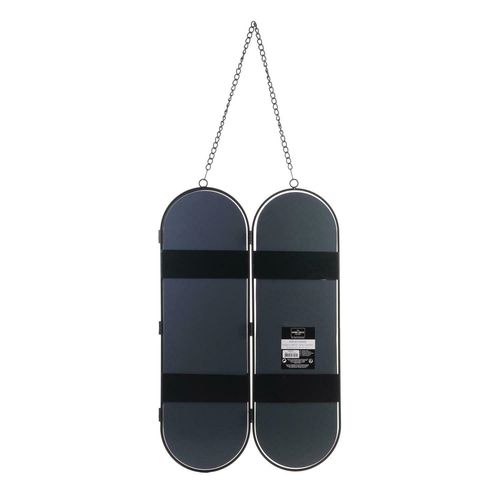 Lustro Intesi Allonge to bardzo praktyczne i efektowne lustro. Składa się ono z trzech owalnych zwierciadeł połączonych ze sobą za pomocą zawiasów. Lustra można dowolnie składać i rozkładać. Lustra zostały zawieszone na metalowym łańcuszku w kolorze czarnym. Łańcuszek posiada karabińczyki dzięki którym można go również odpiąć. Zwierciadła lustra zostały zamontowane w metalowych pomalowanych na czarno ramkach. Lustro będzie idealnym dodatkiem do wnętrz w stylu industrialnym. Wysokość: 53