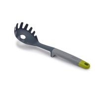 Łyżka do spaghetti Elevate Nylon marki Joseph Joseph to wyjątkowo wygodne narzędzie, które w swojej główce posiada otwór umożliwiający odcedzanie wody, a boczne wypustki przytrzymują nitki makaronu. Dzięki specjalnie wyprofilowanej rączce, już nigdy więcej nie zabrudzisz blatu po odłożeniu łyżki. Jej ergonomiczne wygięcie i obciążnik, utrzymują główkę narzędzia ponad jego powierzchnią, co zmniejsza bałagan i zwiększa higienę przygotowania posiłków. Łyżka zniesie wysokie temperatury gotowanej i smażonej potrawy - nylonowa główka jest odporna na wysokie temperatury do 200°C, a silikonowa rączka do 270°C.
