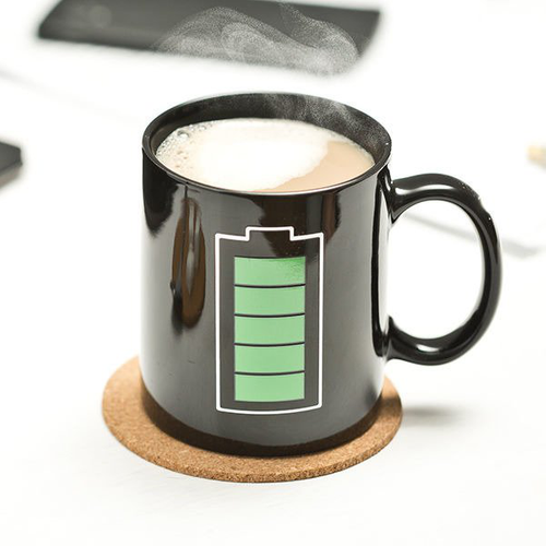 Gadżet w szczegółach:kubek bateriaczarny i z wyczerpaną baterią, gdy zimygotowy do działania i z pełną baterią, gdy wypełniony ciepłym płynemwykonany z ceramikiUwaga! Nie zmywać w zmywarce