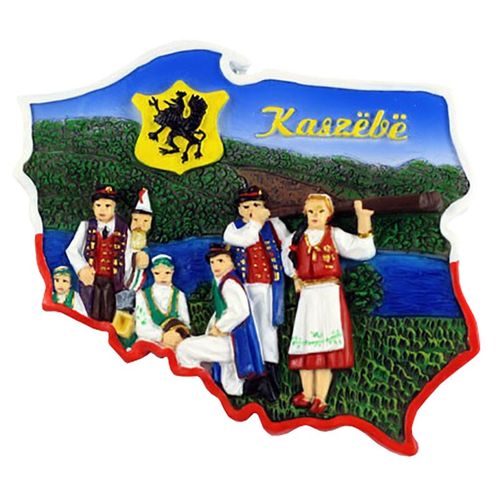 Ręcznie malowany magnes w kształcie granic Polski. Na awersie przedstawiony folklorystyczny Kaszubski zespół.