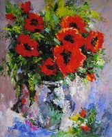 Ręcznie malowany obraz olejny na płótnie bawełnianym! Namalowany za pomocą szpachelki. Zabezpieczony werniksem i sygnowany. Dostępny bez blejtramu. Przedstawia impresję z makami. Charakteryzuje się pięknymi kolorami. Rozmiar - 50x60cm!
