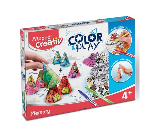 Memory to ulubiona zabawa dzieci, która ćwiczy pamięć oraz zdolność skupienia uwagi. Memory Maped Creativ to zestaw do samodzielnego pokolorowania i udekorowania za pomocą dołączonych naklejek 9 par figurek. Po ich przygotowaniu można przystąpić do gry! Figurki zasłania się dołączonymi stożkami i odnajduje parę. Po zakończonej zabawie figurki i stożki mieszczą się w opakowaniu. Do zestawu oprócz naklejek dołączone są też markery w 12 kolorach.