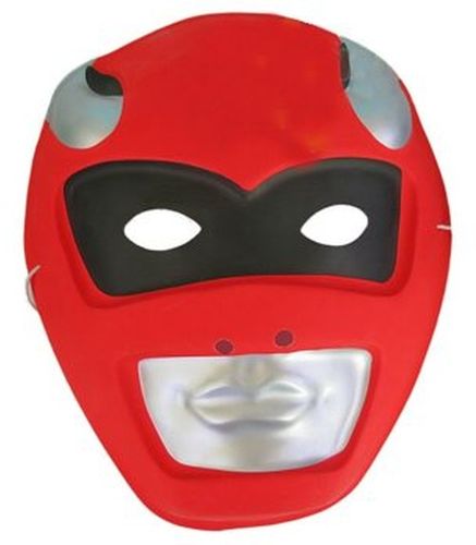 Plastikowa maska na twarz. Wizerunek robota. Kolor czerwony. Z tyłu maski gumka umożliwiająca noszenie maski. Rozmiar uniwersalny. Wymiary maski: wysokość - 20 cm, szerokość - 16 cm