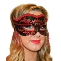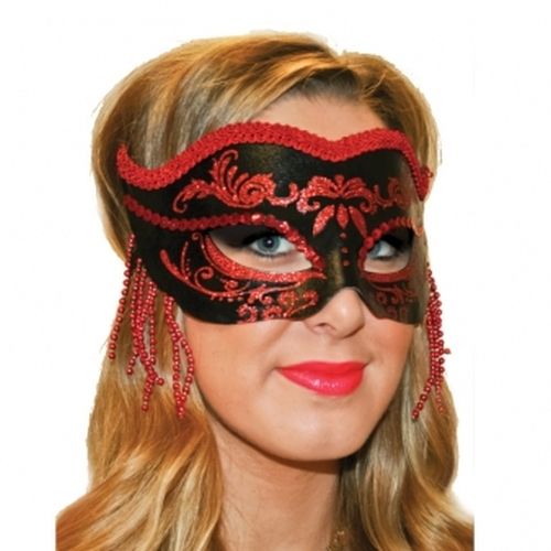 Wenecka maseczka karnawałowa na oczy w kolorze czarnym wykończenia w kolorze czerwonym. Po bokach czerwone koraliki, zdobienia z cekinów i brokatu. Maska jest wyprofilowana do kształtu twarzy, ładnie się układa, zawiązywana z tyłu tasiemką. Od wewnątrz pokryta delikatnym filcem. Całość ładnie i estetycznie wykonana. Rozmiar uniwersalny dla osoby dorosłej.