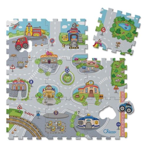 W mieście jest tyle ciekawych miejsc! Miękka Mata Puzzle do zabawy, składana z 9 elementów to bardzo wygodna, miękka mata, na której dziecko może się bawić, raczkować, turlać, a jednocześnie powoli poznaje sytuacje, z jakimi na co dzień stykają się dorośli w miejskim środowisku. Z maty Miasto można wyjąć wóz strażacki i radiowóz policyjny, aby bawić się nimi i symulować jazdę po ulicach wyrysowanych na macie. Elementy, które można wyjąć z poszczególnych puzzli może również posłużyć do zabawy w dobieranie elementu do powstałego w macie otworu. Obrazki na macie są w żywych, nasyconych kolorach, a kształty łatwe do rozpoznania. Mata ma wymiary 93x93 cm. Wykonana jest z siatki polietylenowej. Maty są odporne na przegryzienia. Wykonane są z trwałych, bezpiecznych materiałów o neutralnym zapachu. Matę można myć.