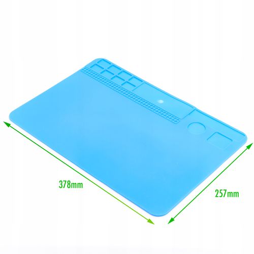 Wysokiej jakości mata silikonowa z wyprofilowanymi przegródkami poprawiająca komfort pracy w każdym serwisie. Antystatyczne właściwości oraz specjalne przegrody umożliwiają organizowanie i segregację elementów elektronicznych, śrubek itp. podczas pracy. Duża płaska powierzchnia oraz odporność na wysoką temperaturę pozwala na lutowanie płyt, ekranów położonych bezpośrednio na macie.