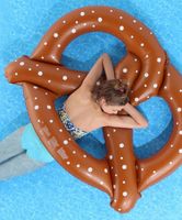 Materac dmuchany w kształcie precla, wykonany z wysokiej jakości plastiku PCV, gwarantującego wytrzymałość.