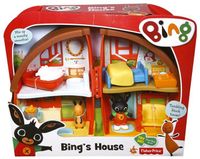 Niedaleko stąd, tuż za zakrętem... znajduje się cudowny Domek Binga! Domek otwiera się, ukazując 2 poziomy do zabawy i mnóstwo wspaniałych akcesoriów! Żywe kolory i detale zachwycą każdego miłośnika serii, a interaktywne miejsca w kuchni i salonie wzbogacą zabawę, pozwalając odgrywać zabawne scenki. W kuchni Bing i Flop mogą przyrządzić pyszne marchwiowe smoothie. Po naciśnięciu przycisku blender podskoczy, „rozlewając” zawartość. W salonie Bing może zbudować wieżę z klocków, która przewróci się po naciśnięciu przycisku! Bing reaguje na naciskanie zabawnym ruchem uszek. W domku znajduje się także łazienka z wanną z bąbelkami oraz sypialnia z łóżkiem z kołderką oraz pudełkiem. Domek łatwo składa się do wygodnego przechowywania i transportowania. W zestawie znajduje się Bing z miękkimi uszkami, Flop, łóżko, wanna, kanpa i pudełko.
