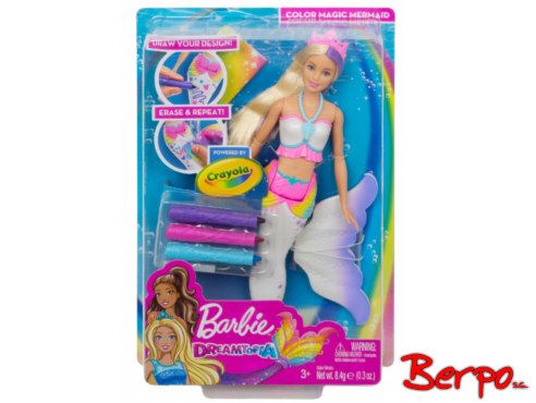 Zanurz się w zabawie pełnej barw! Barbie™ Dreamtopia Syrenka kolorowa magia ma w zestawie zmywalne pisaki Crayola®. Użyj ich do ozdobienia gorestu, ogona i płetwy lalki – tyle razy, ile chcesz! Kiedy zaprojektowany wzór ci się znudzi, możesz po prostu zmyć kolory, używając dołączonego tęczowego ręcznika, a następnie zacząć dekorować od nowa. W opakowaniu znajdziesz trzy pisaki: różowy, fioletowy i niebieski – dzięki temu, masz nieograniczone możliwości stylizacji twojej syrenki. Rysuj wzory, gwiazdki, serduszka i to co tylko przyjdzie Ci do głowy. Rozwiń swoją kreatywność, projektuj i baw się zarazem! Lalka Barbie® syrenka posiada piękny syreni ogon do malowania, gorset a jej głowę zdobi różowy diadem. Uczesz jej piękne, długie, lśniące włosy aby wyglądała wspaniale pod każdym względem.