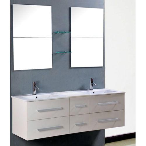 Ładny zestaw mebli łazienkowych, który składa się z: szafki z szufladami, dwóch umywalek, 4 luster i 2 półek szklanych. Umywalki można, jako zestaw, ale również niezależnie od siebie montować. Wąska szafka z szufladami jest do montażu oddzielnego, niezależnie do umywalek. Szafki są wodoodporne, pokryte okleiną, dzięki której szafki zachowują swój pierwotny kolor. Meble posiadają 4 bardzo praktyczne wysuwane szuflady do przechowywania ręczników i przyborów toaletowych. Takie meble łazienkowe to atut każdej łazienki!