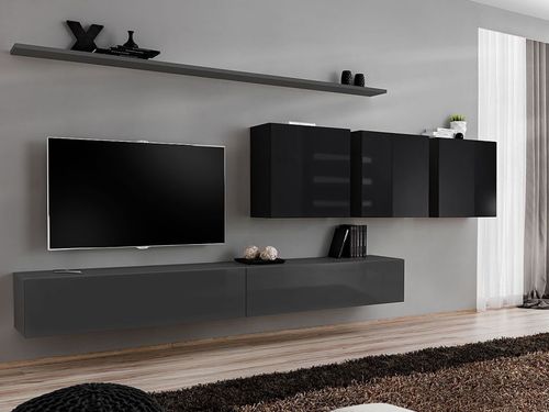 Zestaw SWIT wykonany jest z płyty meblowej laminowanej. Korpusy z obrzeżem ABS, fronty PVC otwierane na push-click, uniwersalny system montażu strony drzwi. Oświetlenie LED w kolorze niebieskim do wybranych elementów znajduje się w zestawie. Meble są nowe, zapakowane w paczkach wraz z instrukcją montażu oraz niezbędnymi okucia do samodzielnego montażu.