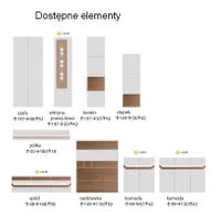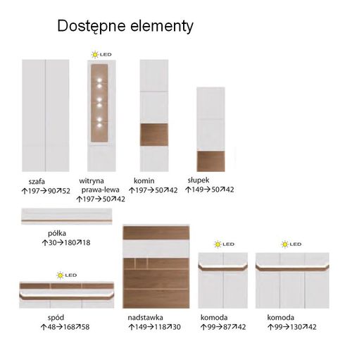 Dostępna kolorystyka (jak na zdjęciu): - korpus: dąb stone - front: biały połysk - wstawki: jasny dąb