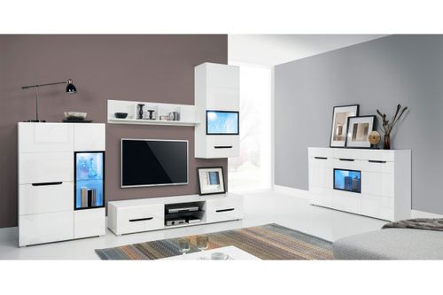 Meble zostały wykonane z płyty laminowanej, korpus został oklejony obrzeżem ABS. Fronty wykonane z płyty MDF w wysokim połysku. Meble charakteryzują się nowoczesną stylistyką oraz niebanalnym wyglądem co sprawi, że Wasze wnętrze stanie się wyjątkowe. Brak możliwości kupna elementów pojedynczo.