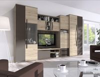 Meblościanka Verdi w kolorze San Remo rustic/San Remo sand+dąb bagienny. Zestaw składa się z dużej, pojemnej szafy, zamkniętej witryny z dwiema szufladami, szafki RTV, panelu RTV oraz przeszklonej witryny z możliwością podświetlenia LED.