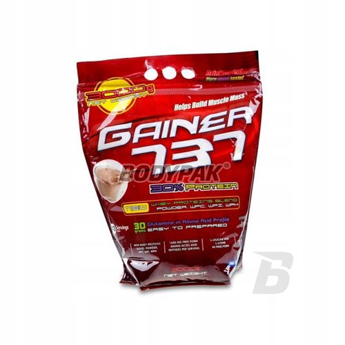 Suplement diety / Środek spożywczy zastępujący całodzienną dietę, do kontroli masy ciała. Nie stosować w przypadku uczulenia na którykolwiek ze składników produktu. Nie należy przekraczać zalecanego dziennego spożycia. Nie może być stosowany jako zamiennik bądź substytut zróżnicowanej diety. Zalecany jest zrównoważony sposób żywienia i zdrowy tryb życia. Produktu nie należy podawać matkom karmiącym oraz kobietom w ciąży. Przechowywać w suchym miejscu, w temperaturze pokojowej do 25°C. Chronić przed światłem. Przechowywać w miejscu niedostępnym dla małych dzieci. SKŁADNIKI AKTYWNE: Gainer 737 Porcja: 70g Ilość porcji w opakowaniu: 43 Opakowanie: 3000g Zawartość: w 100g: zaw: % RWS* Białko 30 g Węglowodany 59 g Tłuszcz 0,8 g Wartość energetyczna 1543 kJ/363 kcal Hydrolizat aminokwasowy 2000mg L-leucyna 100mg L-lizyna 200mg Tiamina (wit. B1) 0,7mg 64% Ryboflawina (wit. B2) 0,9mg 64% Witamina B6 0,8mg 57% Witamina B12 1,6µg 64% Niacyna (wit. PP) 8,8mg 55% Kwas foliowy 220µg 110% Witamina E 6,6mg 55% Witamina C 48mg 60% Biotyna 30µg 60% Kwas pantotenowy 6mg 100% -- Profil aminokwasowy w 100g białka: Izoleucyna 3875mg leucyna 7140mg Walina 4048mg Lizyna 2636mg Metionina 2203mg Fenyloalanina 4759mg Treonina 3031mg Arginina 3868mg Alanina 3144mg Kwas asparaginowy 4170mg Cystyna+cysteina 2588mg Kwas glutaminowy 30344mg Glicyna 4032mg Histydyna 1965mg Prolina 12022mg Seryna 4984mg Tyrozyna 2774mg Tryptofan 973mg Hydroksyprolina 726mg Hydroksyleucyna 84mg Składniki: kompleks serwatkowy 737 (suszona serwatka, koncentrat białek serwatki WPC, izolat białek serwatki WPI, hydrolizat białek serwatki WPH), białko zarodków pszenicy, maltodekstryna, kompleks peptydowo-aminokwasowy 737 (hydrolizat białka kolagenu, hydrolizat białek serwatki, l-leucyna, l-lizyna), aromaty (smak na opakowaniu), witaminy (kwas l-asparaginowy [witamina C], nikotynamid [niacyna], D-alfa-tokoferol [witamina E], D-pantotenian wapnia [kwas pantotenowy], ryboflawina [witamina B2], chlorowodorek pirydoksyny [witamina B6], chlorowodorek tiaminy [witamina B1], l-metylofolian wapnia [foliany], D-biotyna [biotyna], cyjanokobalamina [witamina B12], barwnik E129 dla smaku truskawkowego i malinowego. * % Referencyjna wartość spożycia