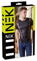 A black shirt made out of stretchy material – beautiful matte material and powernet. There are metal rings on the stitched fabric-covered straps at the front. Matte look 90% polyester, 10% spandex; powernet 90% polyamide, 10% spandex.