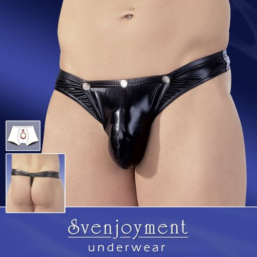 Czarne stringi striptiz w wysokim połysku, sakiewka zapinana na zatrzaski. Materiał: 92% poliester, 8% elastan.