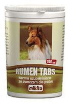 MIKITA Rumen tabs 100 tab. to karma uzupełniająca ze żwaczem dla psów. Szczególnie zalecany dla psów z wyjałowionym przewodem pokarmowym, żywionych karmami przemysłowymi, po przebytych chorobach układu pokarmowego, intensywnie leczonych antybiotykami i chemioterapeutykami, zmniejszonym i „spaczonym” apetycie. Rumen Tabs to mieszanka trzech składników potrzebnych do prawidłowego funkcjonowania przewodu pokarmowego psa: Treść żwacza – naturalne źródło bakterii, pierwotniaków i drobnoustrojów potrzebnych do prawidłowej fizjologii przewodu pokarmowego. Stymuluje perystaltykę jelit, wzmaga apetyt, uzupełnia niedobory flory bakteryjnej, zapobiega wyjadaniu „nieczystości”, odchodów zwierzęcych, padliny. Drożdże piwne – naturalny probiotyk, źródło witamin z grupy B, selenu, biotyny i makro oraz mikroelementów, tonizują przewód pokarmowy, wątrobę, trzustkę, wzmagają łaknienie. Witamina C – naturalny przeciwutleniacz – reduktor działa odtruwająco i stymulująco na organizm.Składniki:Treść żwacza, drożdże piwne, witamina C - 0,1g/1kg.Wskazania: Szczególnie zalecany dla psów z wyjałowionym przewodem pokarmowym, żywionych karmami przemysłowymi, po przebytych chorobach układu pokarmowego, intensywnie leczonych antybiotykami i chemioterapeutykami, zmniejszonym i „spaczonym” apetycie.Stosowanie, dawkowanie: Preparat podawać bezpośrednio w postaci tabletek:Psy małe 1-2 tabl. dziennie,psy średnie 2-4 tabl. dziennie,psy duże 4-6 tabl. dziennie,psy bardzo duże 6-8 tabl. dziennieOpakowanie:100 tabl.