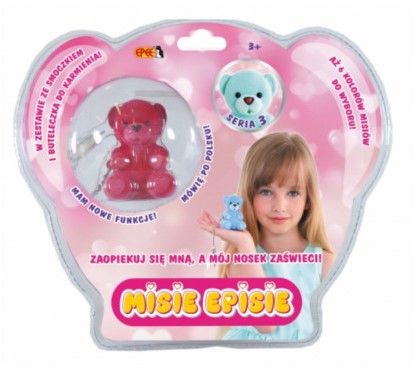 EPEE Miś Epiś Seria 3 02924 Przygarnij Episia i obdarz go miłością i uwagą. Pachnący i delikatny w dotyku miś będzie Twoim nieodłączonym towarzyszem. Gdy zapali mu się nosek, nakarm go dołączoną do modelu butelką, a ten z miłością powie: „Mama, I love you!”. Zabawka posiada praktyczny łańcuszek, dzięki któremu możesz przypiąć ją do plecaka, piórnika czy spodni. Różne wzory. Aukcja dotyczy 1 sztuki - nie ma możliwości wybrania koloru. Zabawka dla dziecka: 3 lata + Waga (z opakowaniem): 0,25 kg