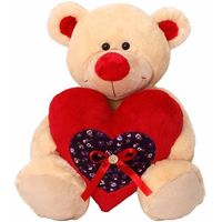Milutki miś Pierrot z czerwonym noskiem i uszkami, w rączce trzyma czerwonogranatowe serduszko z kokardką i drewnianym guziczkiem na środku.