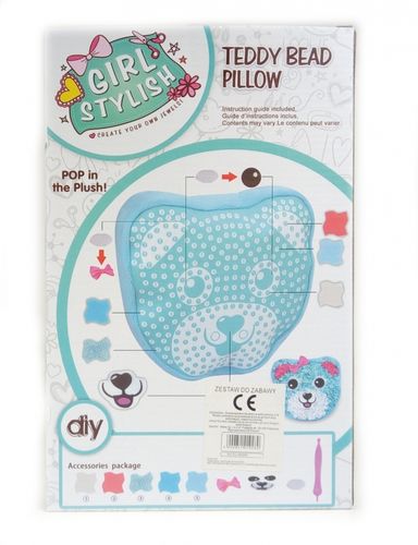 W zestawie znajdziemy wykonaną z miękkiego pluszu małą poduszeczkę w kształcie głowy misia, którą należy ozdobić, załączonymi do zestawu kolorowymi skrawkami materiałów.