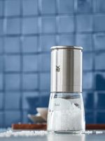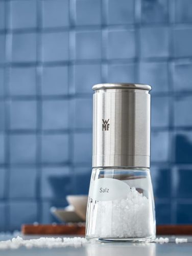 Młynek do soli z serii De Luxe marki WMF o eleganckiej klasycznej formie. Wyposażony w niezwykle trwałe ceramiczne żarna z bezstopniową regulacją stopnia mielenia. Ceramiczne żarna są neutralne dla przypraw, nie zmieniają ich smaku i z powodzeniem mielą pieprz lub sól. Mechanizm mielący znajduje się na górze młynka, a przyprawa na dole w szklanym pojemniku, który można myć w zmywarce.