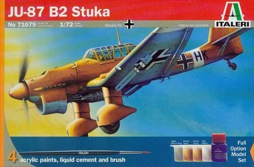 Zestaw zawiera plastikowy model samolotu Junkers Ju87 B-2 Stuka do sklejania, 4 farbki akrylowe firmy Humbrol, klej oraz pędzelek.