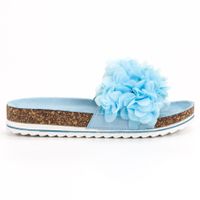 Niezwykle modne klapeczki damskie o prześlicznym niebiańsko-błękitnym kolorze. Buty są doskonałą propozycją na lato jako uzupełnienie niemal każdej stylizacji. Wykonane z wysokiej jakości skóry ekologicznej oraz posiadające przeurocze zdobienie w postaci mięsistych kwiatków na pasku podtrzymującym stopę.
