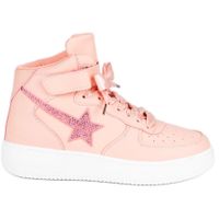 Różowe sportowe buty nad kostkę z ciekawą aplikacją gwiazdy to połączenie wygody i oryginalności. Obuwie wyposażone jest w solidną podeszwę, ma miękkie, przyjemne w kontakcie ze skórą wykończenie, ma ergonomiczną wkładkę i sztywny zapiętek. Wytrzymały materiał nie rysuje się i nie pęka, jest odporny na wilgoć.