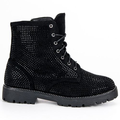 Casualowe workery damskie w czarnym kolorze ozdobione drobnymi kryształkami będą z pewnością bazą wielu interesujących stylizacji w sezonie jesienno-zimowym.