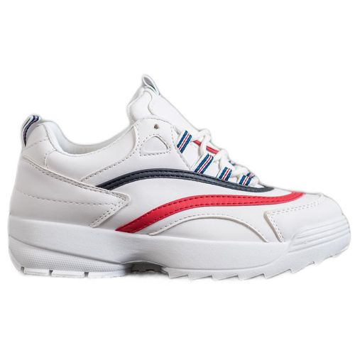 Białe buty sportowe z czerwono-czarnymi obwódkami. To sznurowany model w wyjątkowo modnym stylu. Sportowy fason oraz mnóstwo udogodnień takich jak choćby miękki zapiętek sprawia, że sneakersy są jednymi z chętniej kupowanych butów do codziennego użytku. Weide to wygodne buty ze skóropodobnego tworzywa na wysokiej platformie.