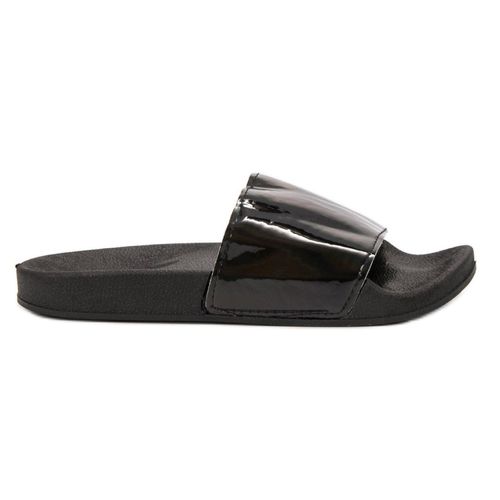 Wykonane z tworzywa skóropodobnego w kolorze czarnym klapki na gumowej, profilowanej podeszwie dobrze układające się na stopie. Błyszczący, szeroki pasek podtrzymujący palce dobrze prezentuje się do casualowych outfitów. Wygodna podeszwa o standardowej wysokości dobrze amortyzuje kroki i sprawia, że buty prezentują się świetnie.