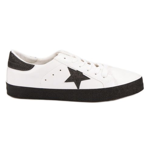 Białe trampki na czarnej podeszwie to nowoczesna odsłona nieśmiertelnego klasyka. Buty zostały wykonane z miękkiej skóry ekologicznej. Materiałowa wkładka zapewnia komfort oraz prawidłową cyrkulację powietrza wokół stopy. Gładka, gumowa podeszwa to gwarancja stabilizacji oraz optymalnej izolacji od podłoża. Kontrastowe elementy znakomicie podkreślają miejski charakter obuwia.