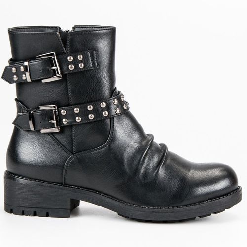 Damskie botki w rockowym stylu, wykonane ze skóry ekologicznej w czarnym kolorze. Wąska cholewka sięga ponad kostki. Ozdobiona jest dwoma paskami z ozdobnymi dżetami i sprzączkami. Buty odpowiednie na jesień i zimę, posiadają grubą podeszwę z tworzywa sztucznego i obcas o wysokości 4cm. Model ocieplany kożuszkiem.