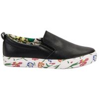 Paniom polecamy dzisiaj modne buty Slipony w kolorze czarnym z kolorową podeszwą. Jeżeli szukacie lekkich butów na lato z modnymi wstawkami, to właśnie one. Nosek butów jest okrągły, nie mają one obcasa, a podeszwa buta jest bieżnikowana - gumowa. Nadają się one na wszystkie pory roku oprócz mroźnej zimy.